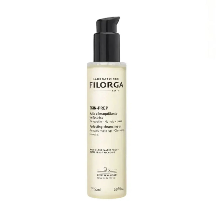 Filorga Skin Prep perfecting cleansing oil is a face cleanser designed to effectively dissolve even waterproof make-up while also eliminating excess sebum, and nourishing and soothing the skin. Its formula, inspired by cleansing techniques used in aesthetic clinics and highly concentrated in Omega 6, has powerful hydrating and emollient properties. Thanks to its Vitamin E content, it also has a restructuring and regenerating effect on the skin. Designed for all skin types, particularly sensitive skin and eyes, this non-greasy cleansing oil has a smooth texture that transforms into a milk on contact with the skin.